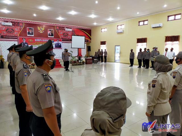 Kapolres Pelabuhan Belawan, AKBP Dr Rahmani Dayan SH MH pimpin pelaksanaan giat Korps Raport Kenaikan Pangkat personel dan ASN di Aula Wira Satya Polres Pelabuhan Belawan, Kamis (2/7) pukul 08.00 Wib.