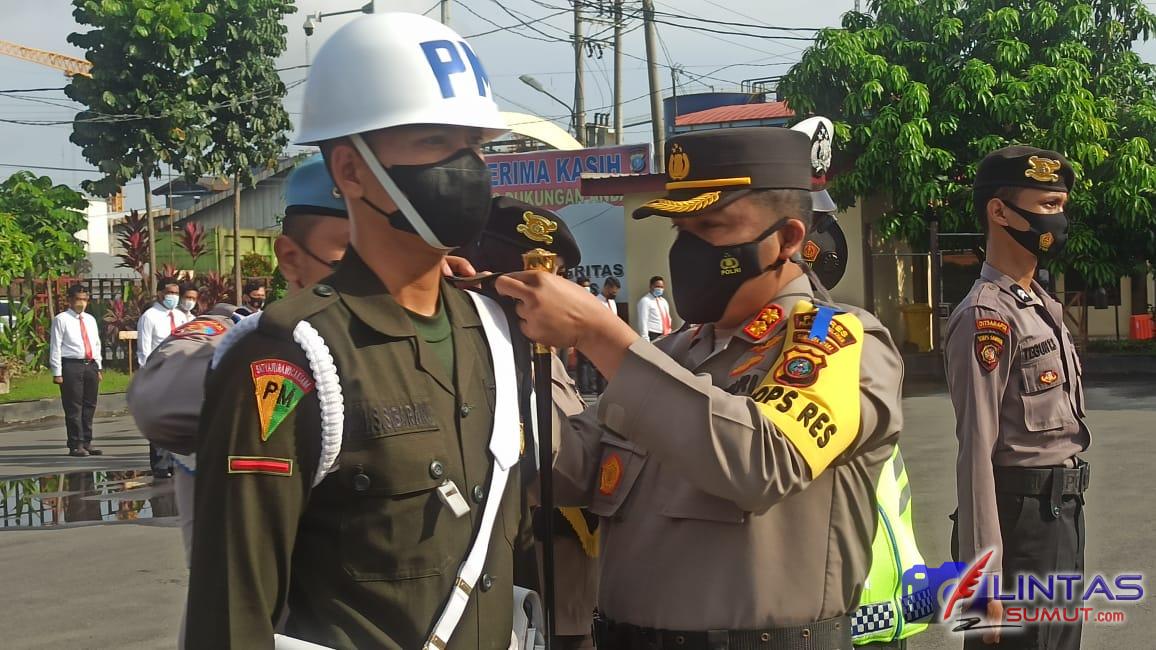 Dalam Apel gelar pasukan tersebut, Kapolres Pelabuhan Belawan menyematkan pita tanda Operasi Zebra Toba 2021 dan membacakan amanat dari Kapolda Sumut. (Rj Samosir)