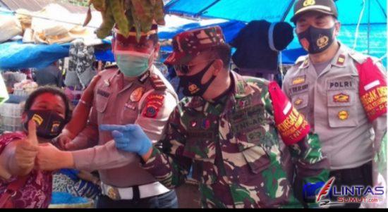 Lintas Sumut | Simalungun – Personil TNI-POLRI dan Tim Medis Puskemas Raya, Lurah dan Camat dibantu Sejumlah Sat Pol PP melaksanakan pembagain masker sebanyak 100 pada pengunjung dan pedagang dipekan