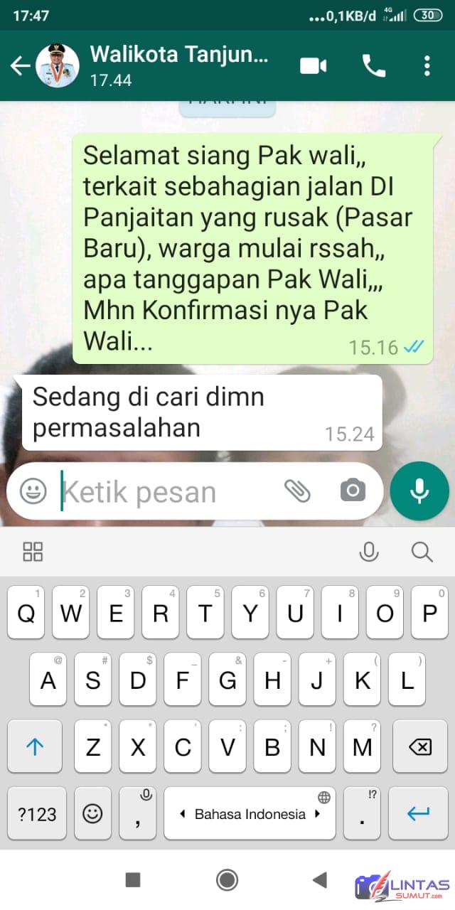” Selamat siang Pak wali,, terkait sebahagian jalan DI Panjaitan yang rusak (Pasar Baru), warga mulai resah,, apa tanggapan Pak Wali, Mhn Konfirmasi nya Pak Wali, dan Walikota Tanjun Balai membalas WhatsApp, Sedang di cari dimn permasalahan, jawabnya melalui WA dan mengakhiri.