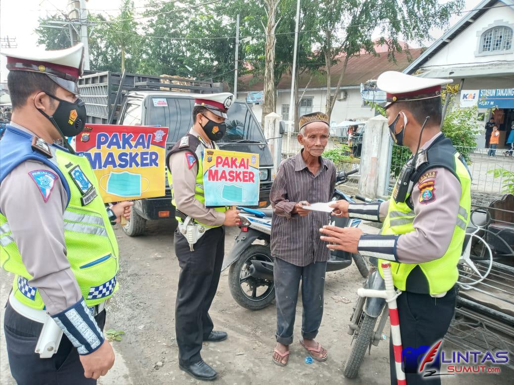 Bertempat di jalan Suprapto, Sat Lantas Polres Tanjung Balai menggelar pembagian Masker secara gratis serta menghimbau para pengguna jalan agar tetap terbiasa memakai masker sehingga dapat mencegah penyebaran Covid-19, Kamis (14/1/2021) sekitar pukul 9.30 Wib.