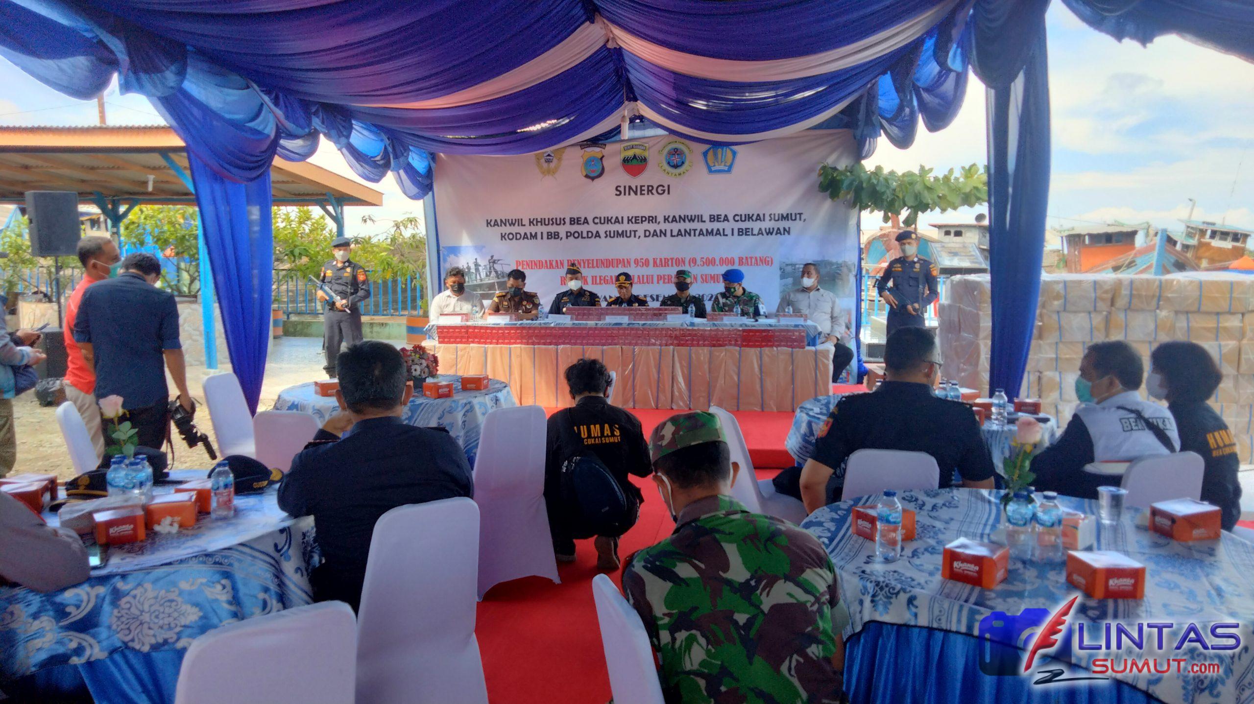 Tim patroli Bea dan Cukai dari kanwil khusus Bea dan Cukai Kepulauan Riau dengan kapal BC-10002 bersenergi dengan kantor Bea dan Cukai Kanwil Sumut melakukan penindakan dan penyedikan atas 1 (satu) unit kapal motor dengan nama kapal KM. Kembar Mandiri GT. 165 diperairan timur laut pulau berhala, sumatera utara 27 November 2021, yang berasal dari Singapura tujuan Sigli, Aceh, dengan muatan sebanyak 9.500.000 (Sembilan juta lima ratus ribu) batang rokok yang akan diselundupkan dan dibongkar diluar pelabuhan resmi untuk menghindari petugas. (14/12/21).
