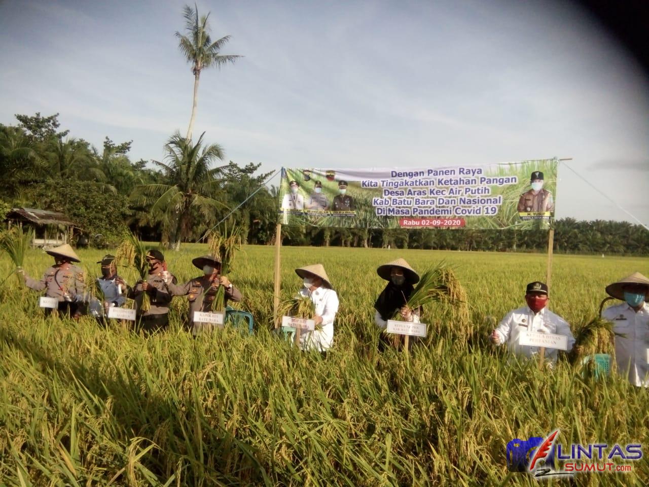 Bupati Batu Bara Ir. Zahir MAP dan Kapolres Batu Bara AKBP Ikhwan Lubis SH. MH melaksanakan potong padi pada acara Panen Raya dalam meningkatkan ketahanan pangan nasional, tepatnya di areal persawahan dusun 1 Desa Aras Kec. Air Putih, Rabu (2/9) sekira pukul 08.00 Wib.