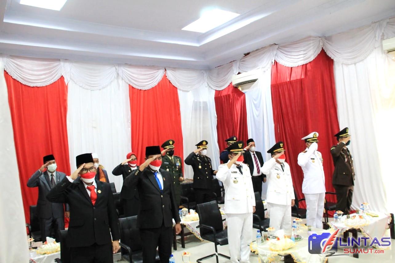 Bupati Tapanuli Tengah Bakhtiar Ahmad Sibarani didampingi Wakil Bupati Tapanuli Tengah Darwin Sitompul bersama Forkopimda Tapanuli Tengah dan undangan terbatas mengikuti Upacara Peringatan Detik-detik Proklamasi Kemerdekaan Republik Indonesia dalam rangka HUT ke-76 Republik Indonesia melalui video conference (vidcon) yang dilaksanakan di Ruang Rapat Cendrawasih Kantor Bupati Tapanuli Tengah, Selasa (17/08/2021).