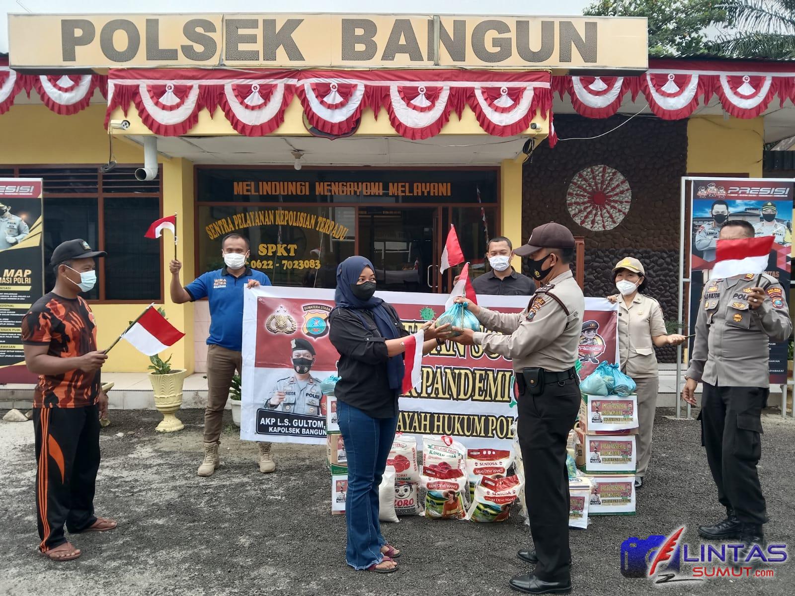 Menyambut HUT Republik Indonesia (RI) ke 76, Kapolsek Bangun AKP L.S Gultom SH bersama personil memberikan bantuan sembako kepada warga terdampak Covid 19 di Mako Polsek Bangun Jalan Asahan Km. 17 Nagori Bangun Kecamatan Gunung Malela Kabupaten Simalungun, Kamis (5/8/2021) pagi sekira pukul 10.00 Wib.