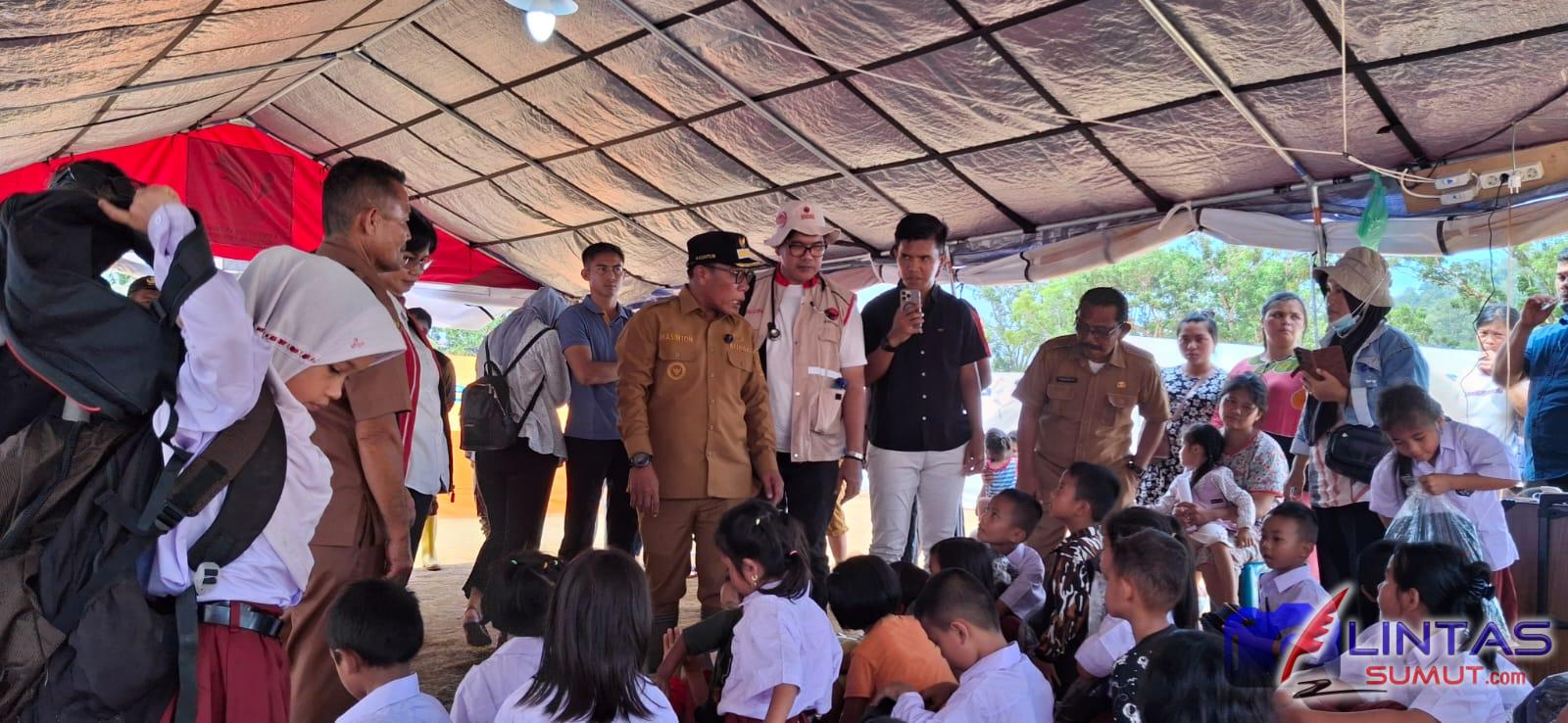 Satu per satu siswa disapa. Senyum yang sempat pudar perlahan kembali merekah ketika tas, buku, dan alat tulis diserahkan ke tangan-tangan kecil yang sebelumnya kehilangan segalanya.