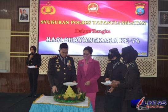 Peringati Hari Ulang Tahun (HUT) Bhayangkara ke-74, Kapolres Tapanuli Selatan (Tapsel) AKBP Roman Smaradhana Elhaj bersama Bupati Kabupaten Padang Lawas Utara (Paluta) Andar Amin Harahap,S.STP.MSi dan Bupati Tapsel H.Sahrul M Pasaribu ,SH gelar acara syukuran usai menggelar upacara virtual Rabu (1/7) diruangan Pratidina Mapolres setempat.