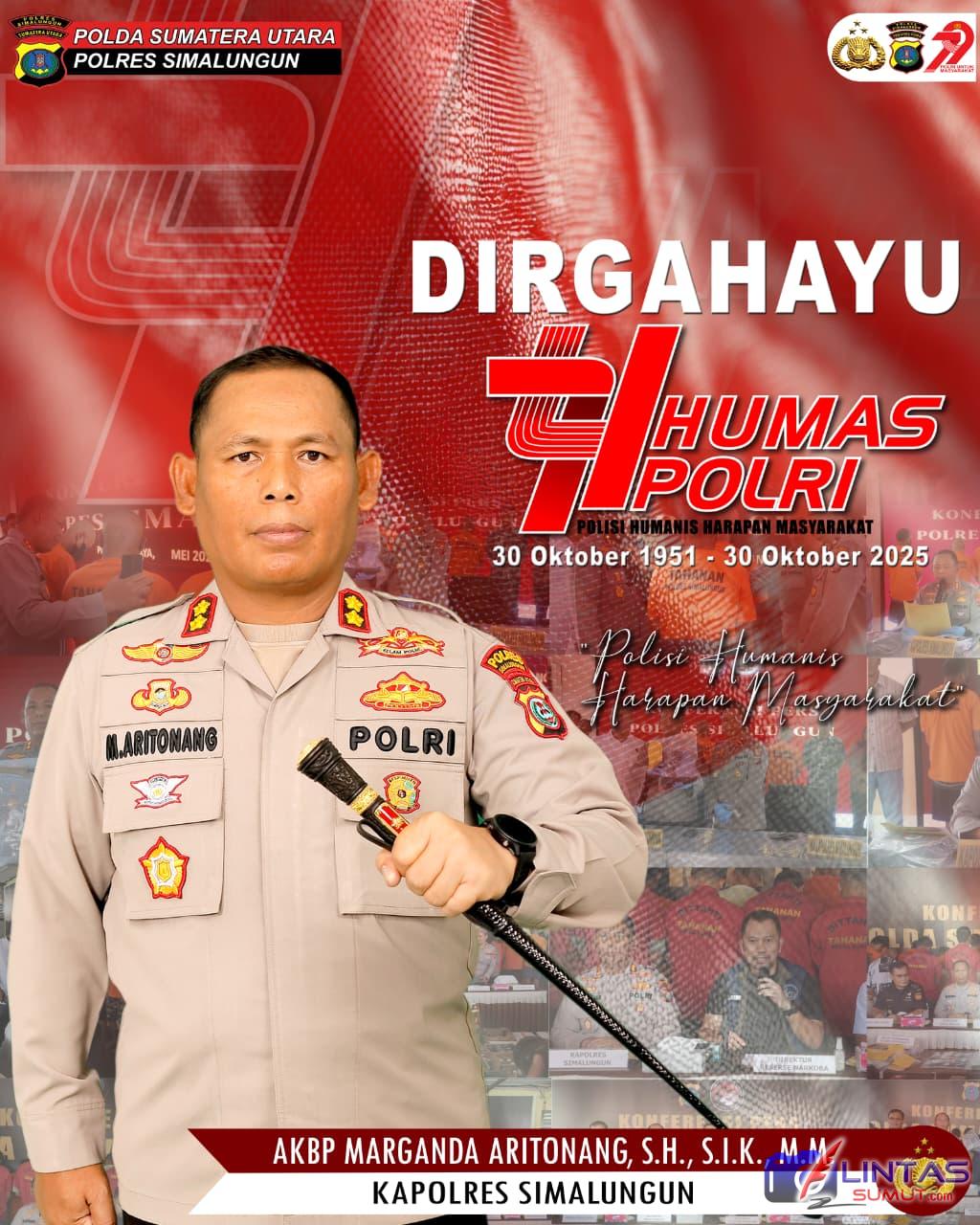 Kapolres Simalungun AKBP Marganda Aritonang, S.H., S.I.K., M.M., menyampaikan ucapan selamat kepada seluruh jajaran Humas Polri di Indonesia, khususnya Humas Polres Simalungun, atas peringatan Hari Jadi ke-74 yang mengusung tema “Polisi Humanis Harapan Masyarakat”. Ucapan ini disampaikan saat dikonfirmasi pada hari Kamis, 30 Oktober 2025, sekitar pukul 18.10 WIB.