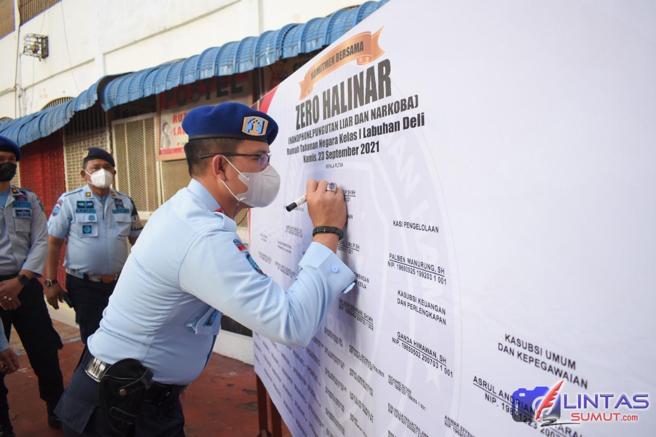 Selanjutnya,Dalam pelaksanaannya penandatanganan Palita Zero Halinar oleh Karutan dan pejabat struktural serta seluruh pengawas Rutan Klas l Labuhan Deli.