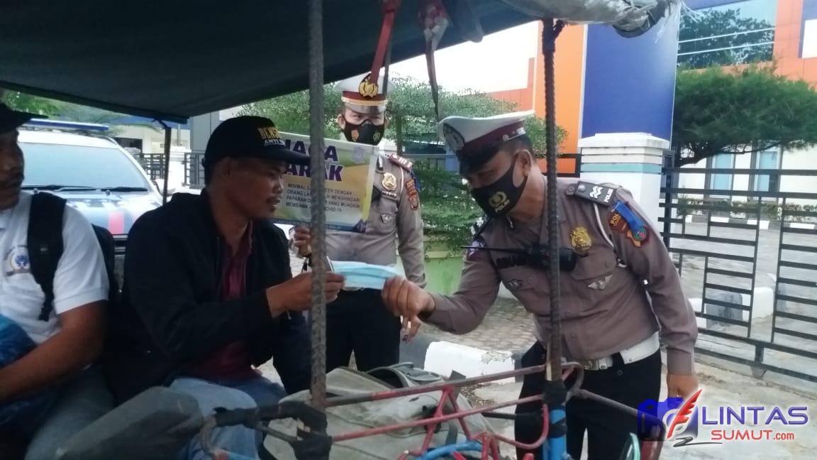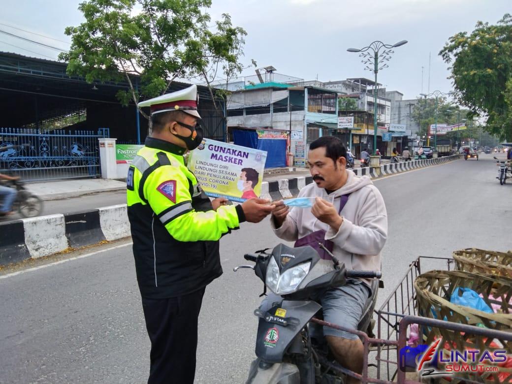 Giat pemberian Masker gratis dari Sat Lantas Polres Tanjungbalai kepada masyarakat berkendaraan yang melintas di Jalan Jend. Sudirman Kota Tanjungbalai, Terang Kapolres Tanjungbalai AKBP Putu Yudha Prawira SIK MH.