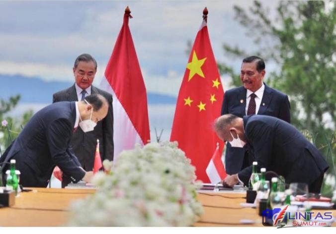 Tanda Tangan Menteri Luar Negeri RRT Wang Yi dan Menteri Koorditor Bidang Kemaritiman dan Investasi RI Luhut Binsar Pandjaitan menyaksikan penandatangan MoU kerja sama antara RI-RRT, di Parapat, Kecamatan Girsang Sipangan Bolon, Simalungun,