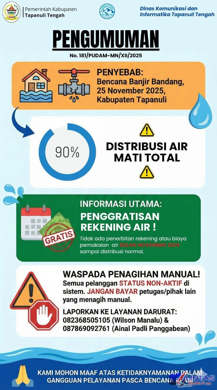 No. 181/PUDAM-MN/XII/2025 tentang rekening air gratis bagi masyarakat Kabupaten Tapanuli Tengah yang terdampak bencana alam banjir bandang dan longsor di Kabupaten Tapteng.
