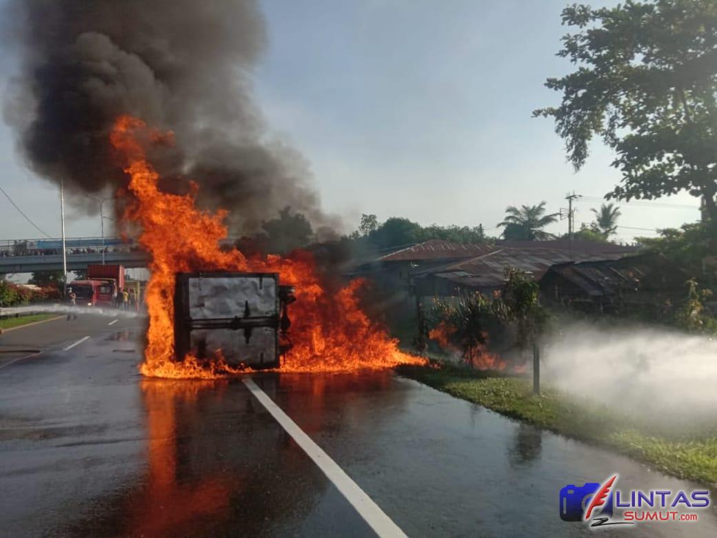 Akibat kebakaran truk tersebut, jalan macat karena petugas memadamkan api yang membakar mobil itu. (M. Siregar)
