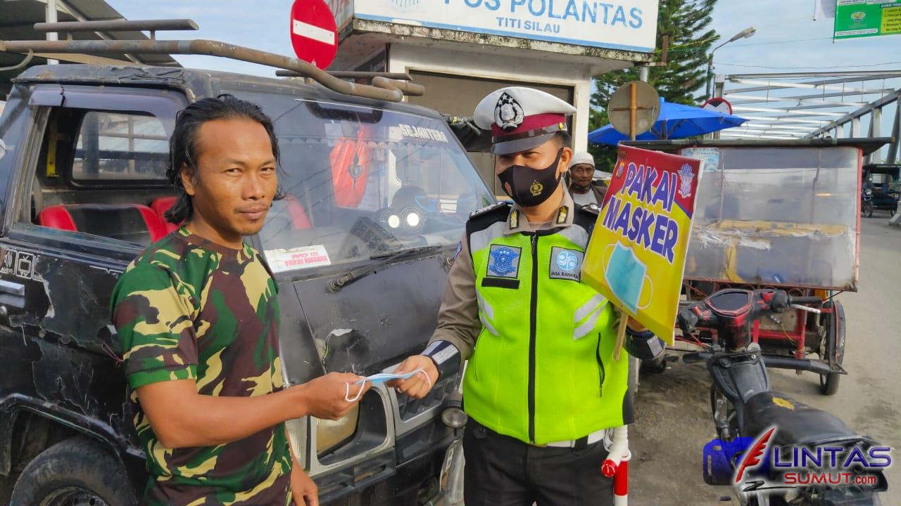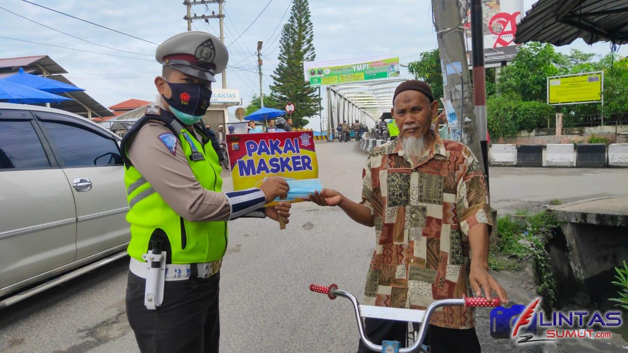 Ket Foto | Giat pemberian Masker gratis dari Sat Lantas Polres Tanjung Balai kepada masyarakat berkendaraan yang melintas.