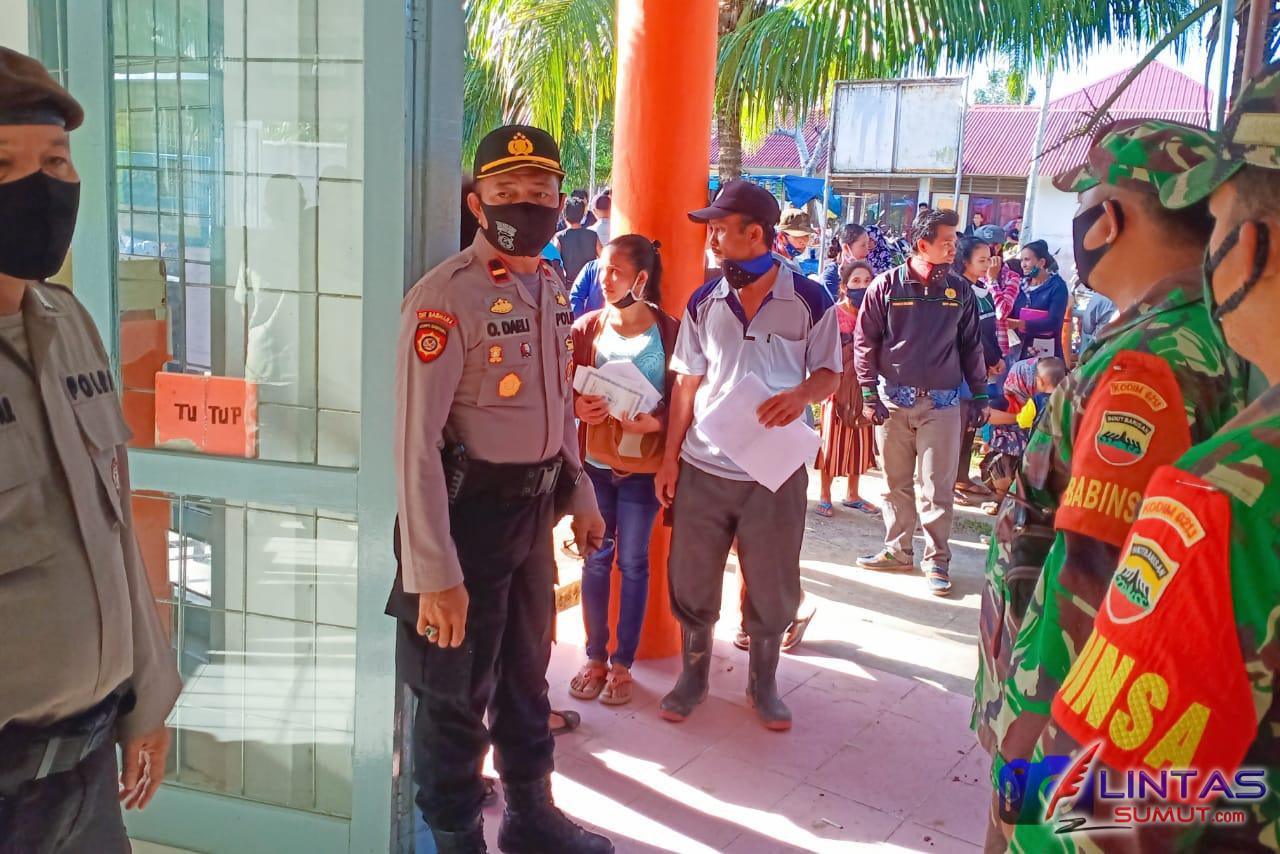 Kapolsek sirombu Ipda O. Daeli memantau pelaksanaan Pembagian Bantuan Sosial Tunai (BST), di Kantor Pos dan Giro Sirombu. Senin (15/06/2020).