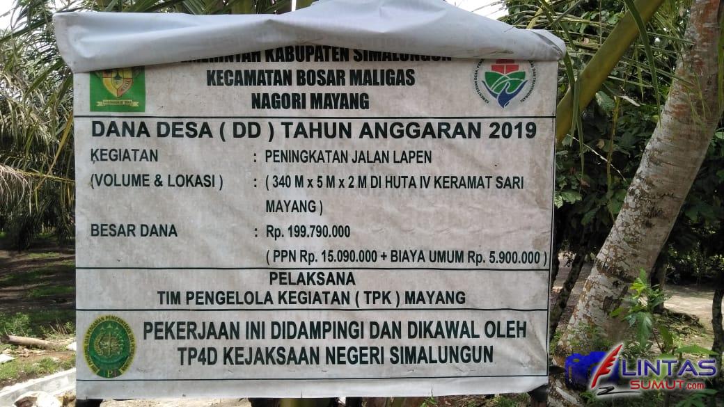 Perealisasian pembangunan peningkatan Jalan Lapen sumber Dana Desa Tahun 2019 dan peruntukan Dana Badan Usaha Milik Desa (Bumdes) Desa Mayang Kecamatan Bosar Maligas Kabupaten Simalungun dipersoalkan warga, pasalnya pada papan prealisasian Bumdes tertulis peruntukan dana untuk pembanguna lapen sedangkan perealisasiannya dilapangan untuk membuka jalan dan membangun Drainase, selain itu peruntukan Bundes diduga melangalahi prosedur dan tidak tranparan kepada warga setempat hal itu diungkapkan AR(60) didampingi DK(55) dan ST (67) warga desa setempat kepada awak media belum lama ini, Selasa (9/6).