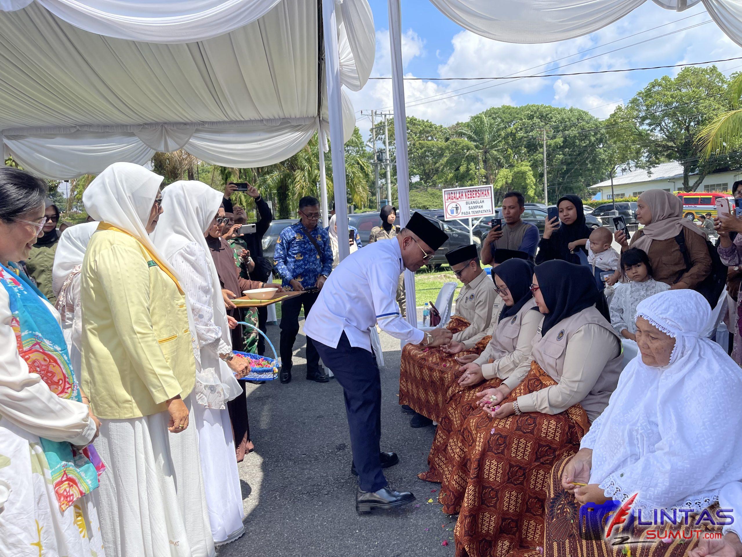 Suasana penuh khidmat menyelimuti halaman Masjid Asy Syuhada Korem 022/PT, Jalan Asahan, Kecamatan Siantar, Kamis (16/04/2026). Pemerintah Kabupaten (Pemkab) Simalungun menggelar acara tepung tawar kepada 104 jamaah calon haji (calhaj) musim haji 1447 H/2026 M.