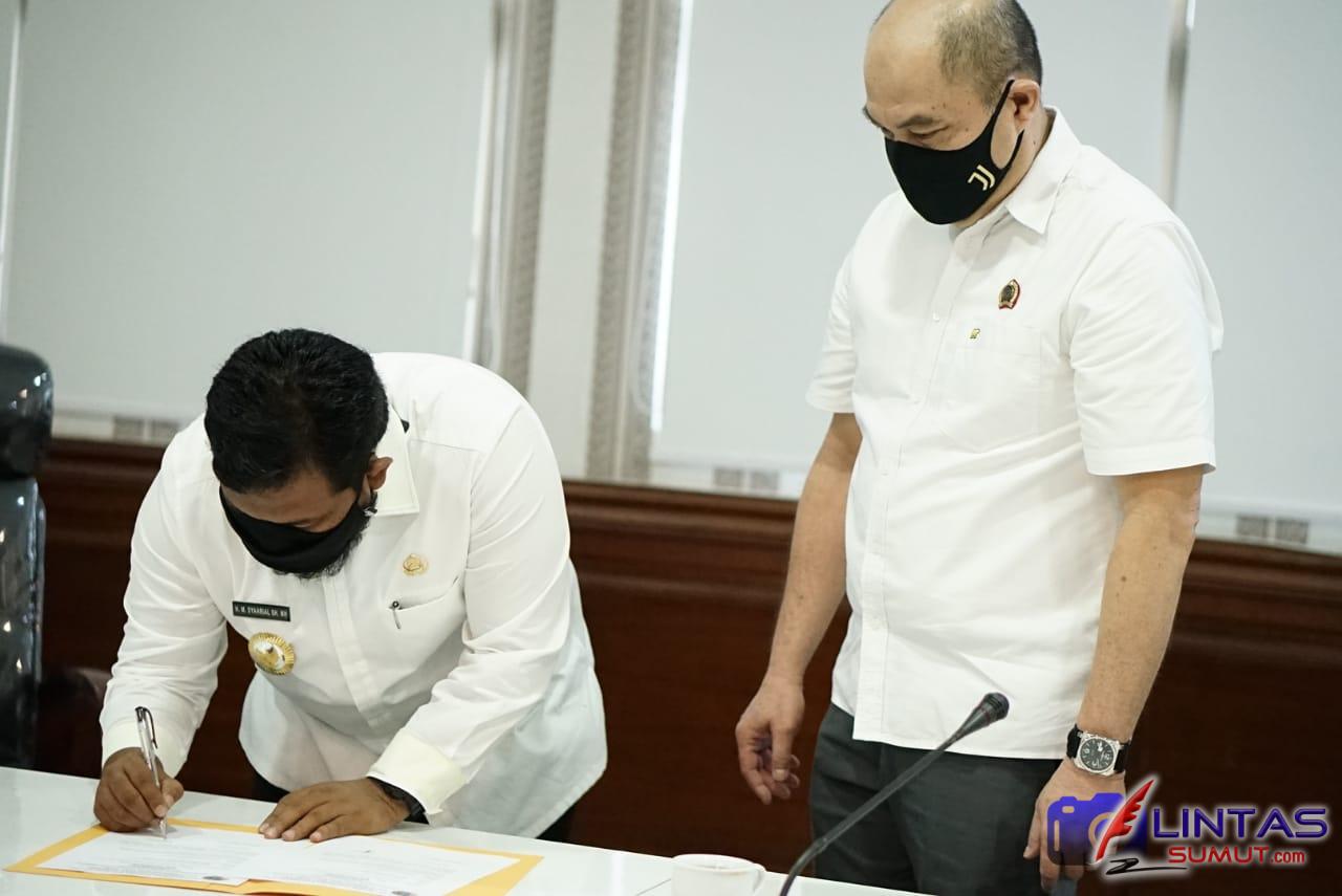 Wali Kota Tanjungbalai, H.M Syahrial SH,MH menerima Peta Zona Nilai Tanah (ZNT) dari Kepala Kantor Pertanahan Kota Tanjungbalai Imansyah Lubis, SH. Hal ini Ditandai dengan penandatanganan berita acara serah terima, softcopy dan hardcopy ZNT yang dilaksanakan di aula Thamrin Munthe, Kantor Wali Kota Tanjungbalai Rabu, (20/1/2021).