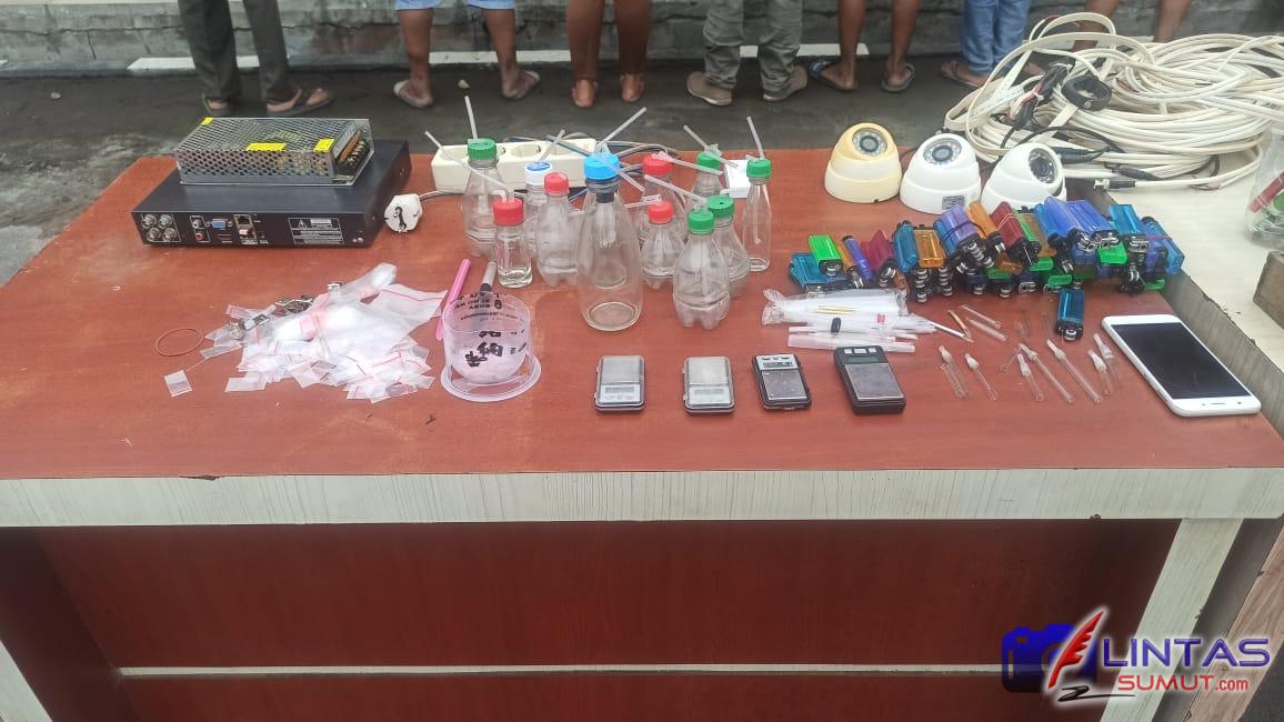 “Dari lokasi penggrebekan kami juga menemukan sejumlah barang bukti berupa alat hisap shabu, 1 platik klip berisi shabu, puluhan plastic klip kosong, mancis, timbangan digital dan lain – lain. Serta 1 unit rangkaian CCTV yang sementara ini kami duga sebagai alat untuk melihat situasi apabila petugas datang untuk melakukan penggrebekan” Sambung Kasat Narkoba.