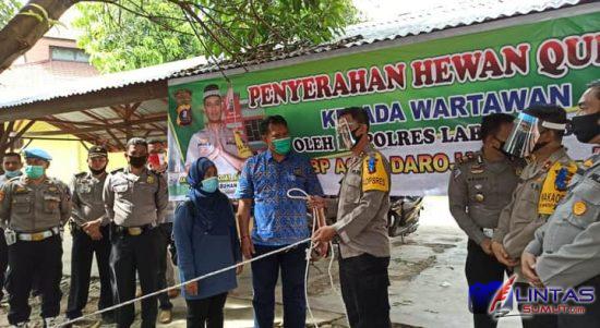 Lintas Sumut | Labuhanbatu – Kapolres Labuhanbatu AKBP Agus Darojat S.IK, MH, didampingi PJU (Para pejabat utama) menyerahkan seekor sapi kurban yang diterima langsung Ketua Persatuan Wartawan Indonesia (PWI) Kabupaten