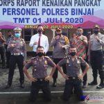 LINTAS SUMUT | BINJAI – Sebanyak 50 personil yang bertugas di Mapolres Binjai dan jajarannya mendapatkan kenaikan pangkat terhitung mulai tanggal 1 Juli 2020. Upacara kenaikan pangkat tersebut dipimpin Kapolres