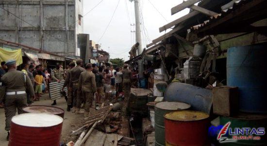 Lintas Sumut | Batu Bara – Makan badan jalan, Warung milik Tambok boru Sirait dibongkar Pemerintahan Kecamatan Air Putih Kabupaten Batu Bara, direncanakan jalan tersebut akan di Hotmix tepatnya di