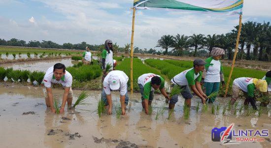 Lintas Sumut | Asahan – Himpunan Kerukunan Tani Indonesia (HKTI) Asahan serahkan bibit padi dan Tanam bersama petani Asahan. Kegiatan ini dilakukan bersama petani sawah di Desa Panca Arga Kecamatan