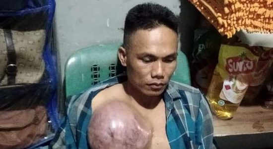 Lintas Sumut | Asahan – Kasiadi warga Desa Sei Kamah Baru Kecamatan Sei Dadap penderita benjolan besar didada sebelah kanan yang lagi viral di media sosial (Facebook) hari ini dibawa