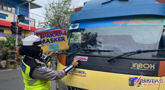 LINTAS SUMUT – TANJUNGBALAI- Satuan Lalu Lintas Polres Kota Tanjungbalai memasang stiker “Ayo Pakai Masker” di kendaraan angkutan umum dan kendaraan pribadi, kegiatan tersebut untuk mencegah penyebaran Covid-19. Rabu (17/02/2021)