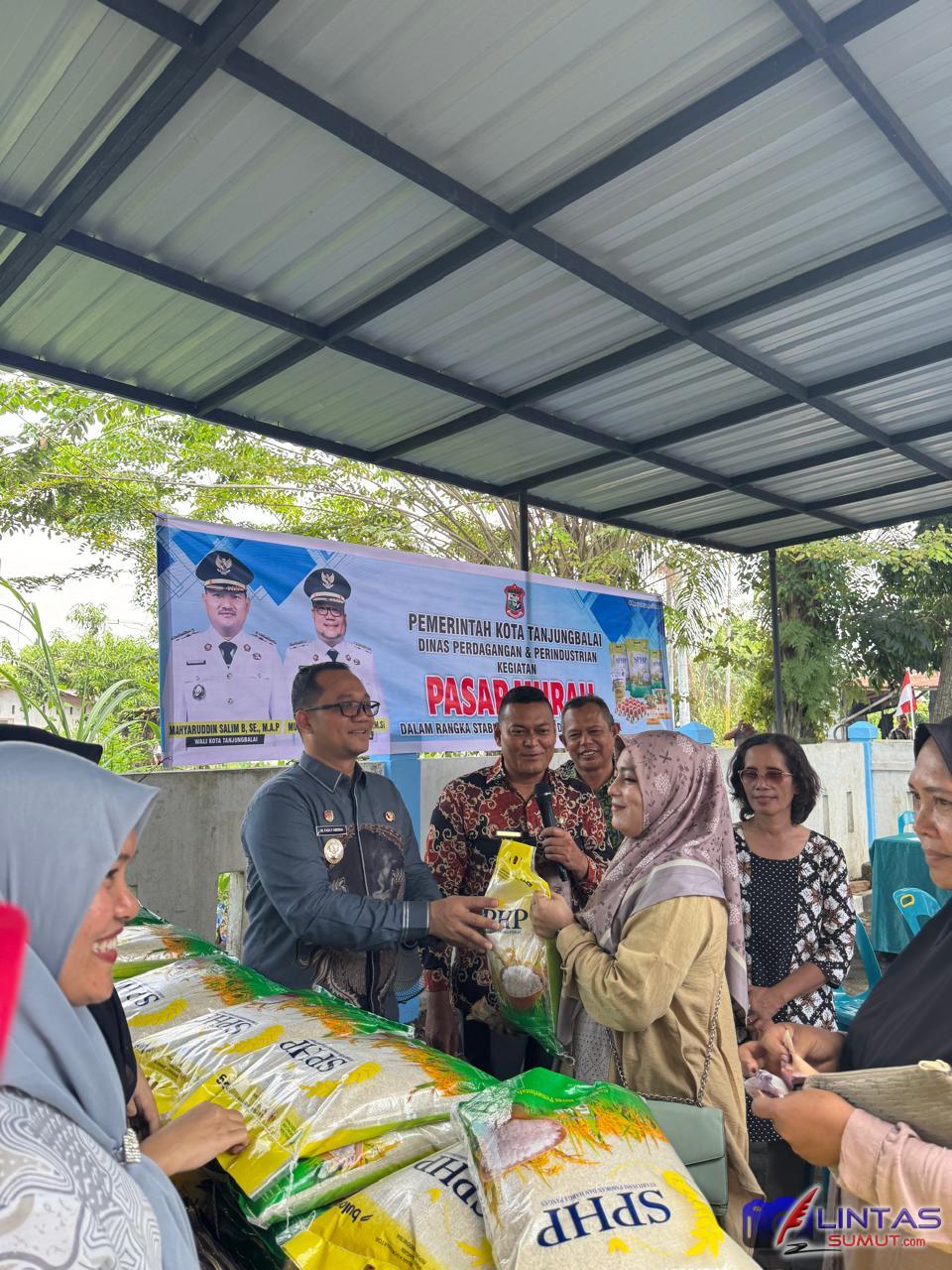 Tampak hadir pada kegiatan tersebut Asisten Ekbang drh Muslim, Kadis Perdagangan dan Perindustrian Yustina Clara, Perwakilan Perum Bulog Divre Kisaran, Camat Teluk Nibung Muhammad Ali, Lurah dan Kepala Lingkungan se Kecamatan Teluk Nibung serta masyarakat setempat.