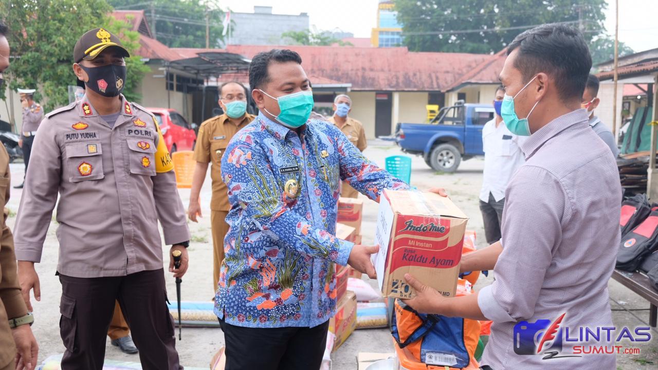 Walikota Tanjung Balai H Mhd Syahrial SH MH menyerahkan bantuan kepada korban kebakaran Asrama Polsek Tanjung Balai Selatan Polres Tanjung Balai, Selasa (11/8) sekitar pukul 17.00 Wib.